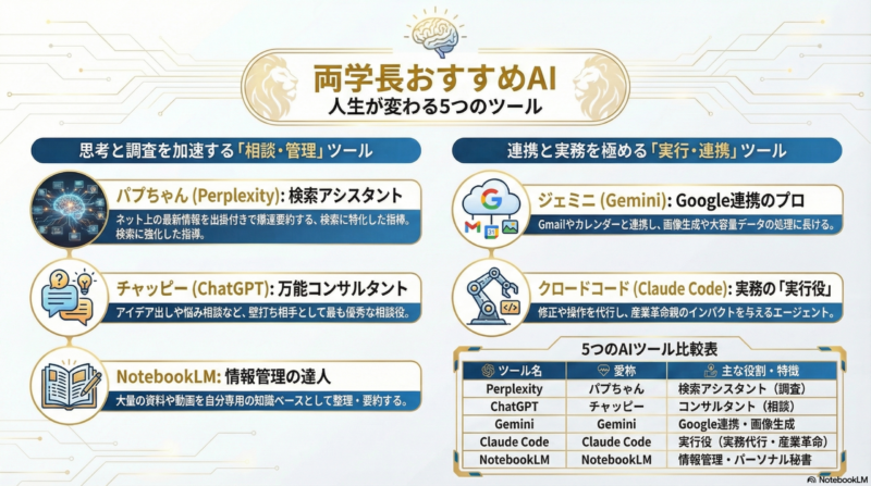 - 学長の推し理由:Googleが持つ膨大なデータ(YouTube動画や検索エンジン)を学習しており、Gmailやスプレッドシートとの連携が非常にスムーズな点。